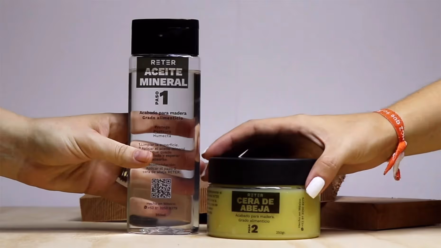 Primero, aplica el aceite mineral para nutrir la madera. Después, usa la cera de abeja para sellar y proteger, siguiendo las instrucciones detalladas para un cuidado óptimo.
